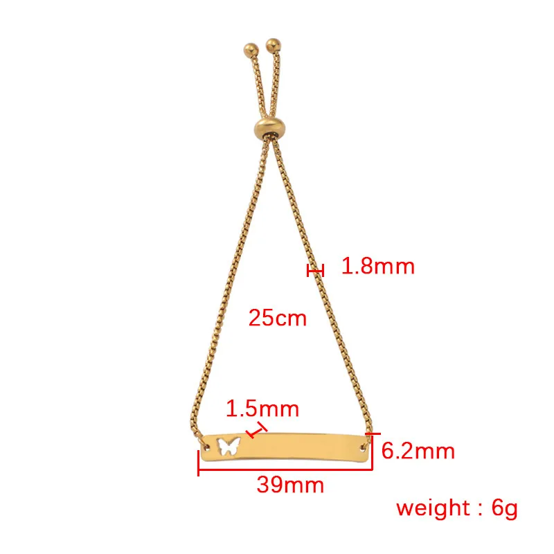 Descubre la elegante Pulsera con mariposa personalizable de acero inoxidable chapada en oro 18k. Incluye un grabado a laser para añadir un toque único. Disponible en colores negro, dorado, plateado y oro rosa, esta pulsera es ideal para lucir con cualquier atuendo y tamaño de 39mm x 6.2mm. ¡Personaliza tu estilo con esta hermosa pulsera!